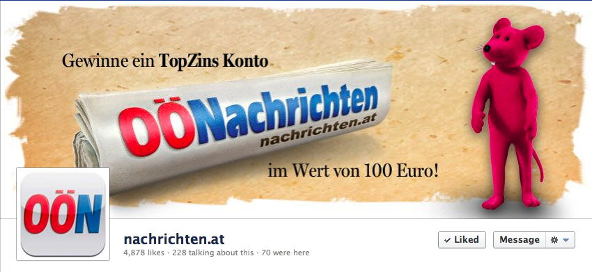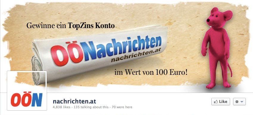 Das Titelbild von nachrichten.at (OÖN – www.facebook.com/nachrichten.at) kombiniert die Darstellung der Zeitung mit Werbung für den Hauptsponsor direktanlage.at. Ursprünglich wurden das Profilfoto und das Titelbild verschnitten miteinander dargestellt (Bild 1). Doch damit wurde das Profilbild etwas „verwaschen“. Daher ging man in einem zweiten Schritt wieder zur getrennten Darstellung über und das Profilbild, welches das Logo der Oberösterreichischen Nachrichten zeigt, kommt wieder deutlicher zur Geltung (Bild 2).